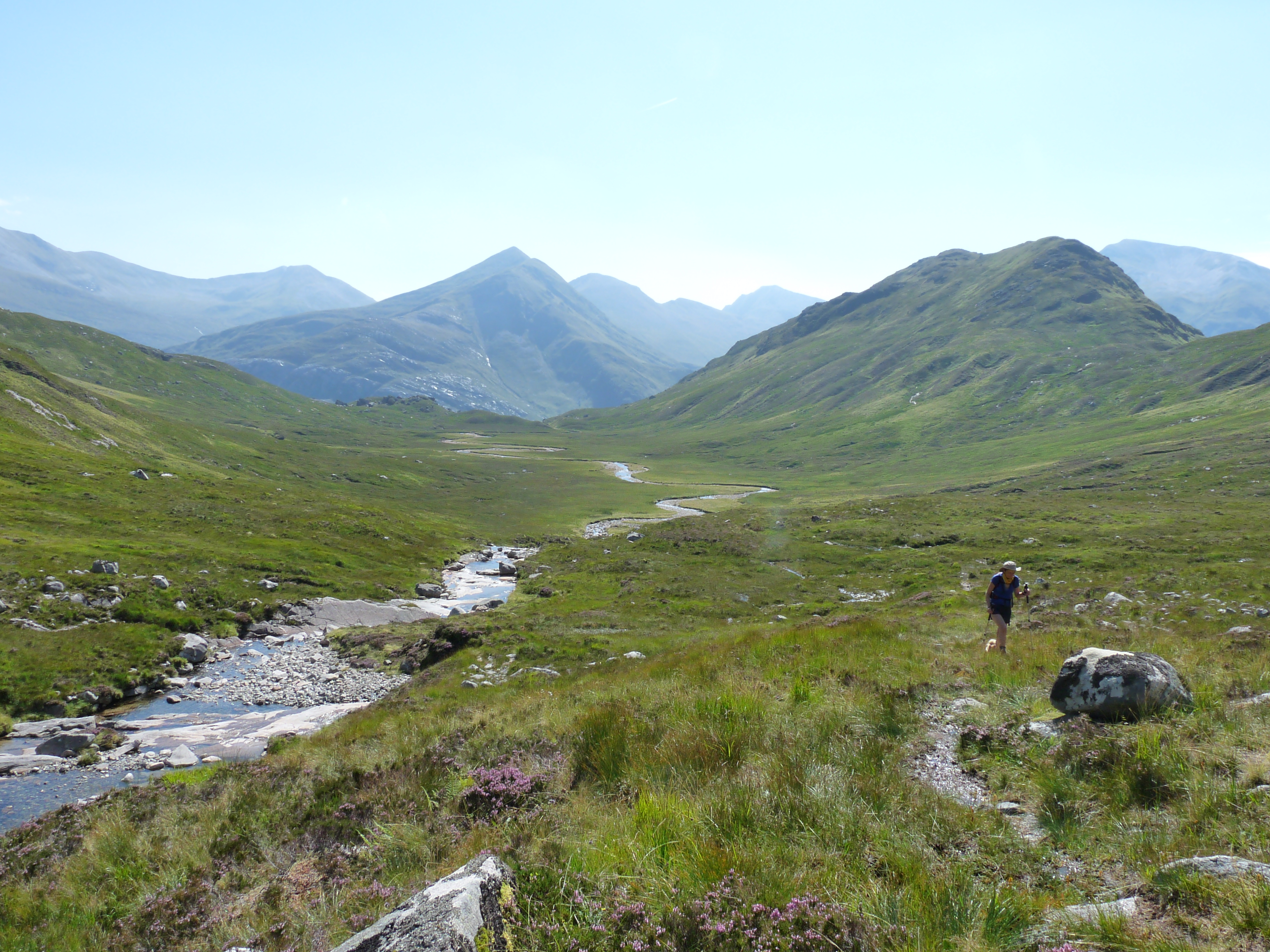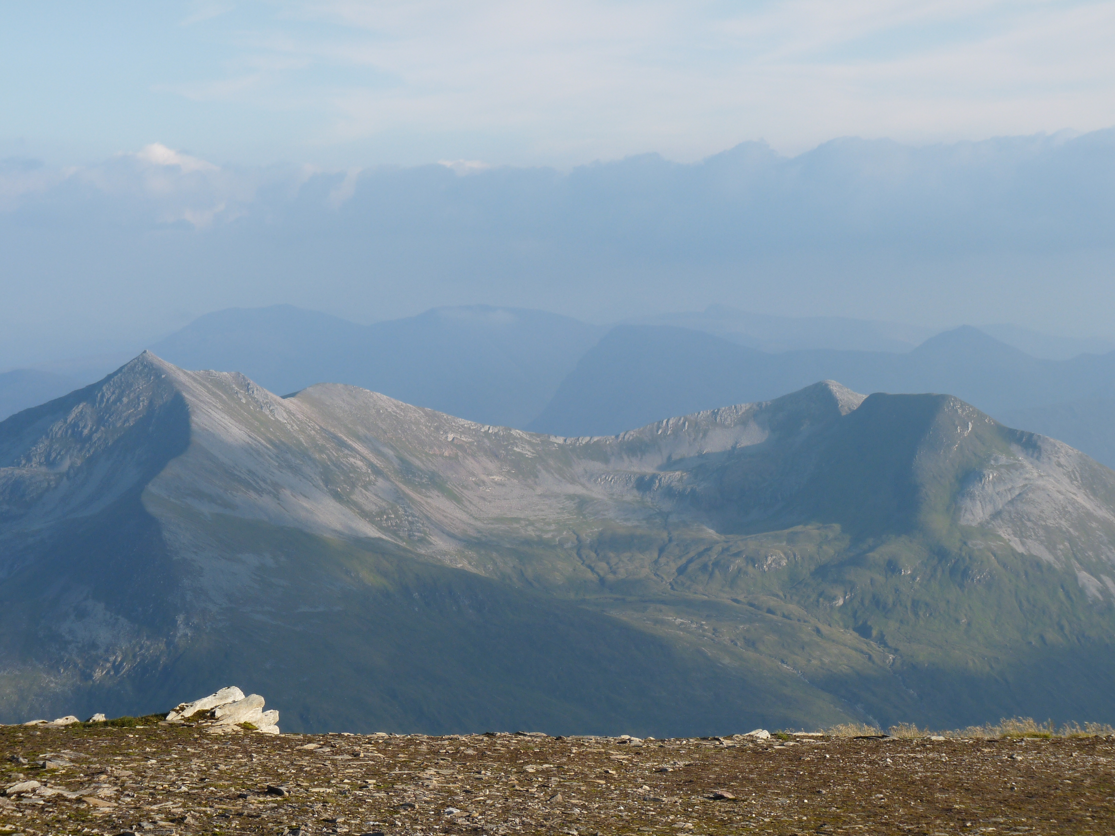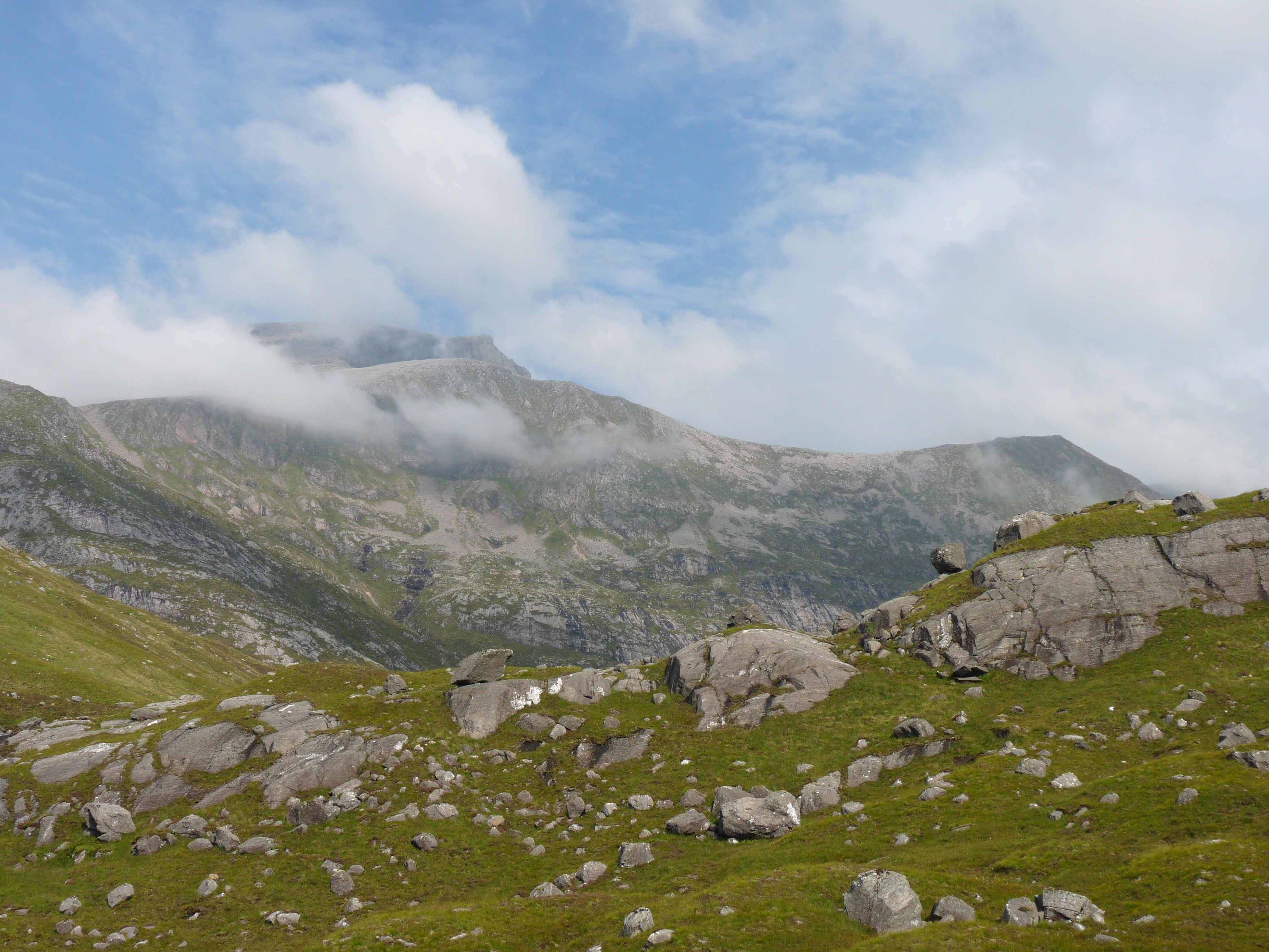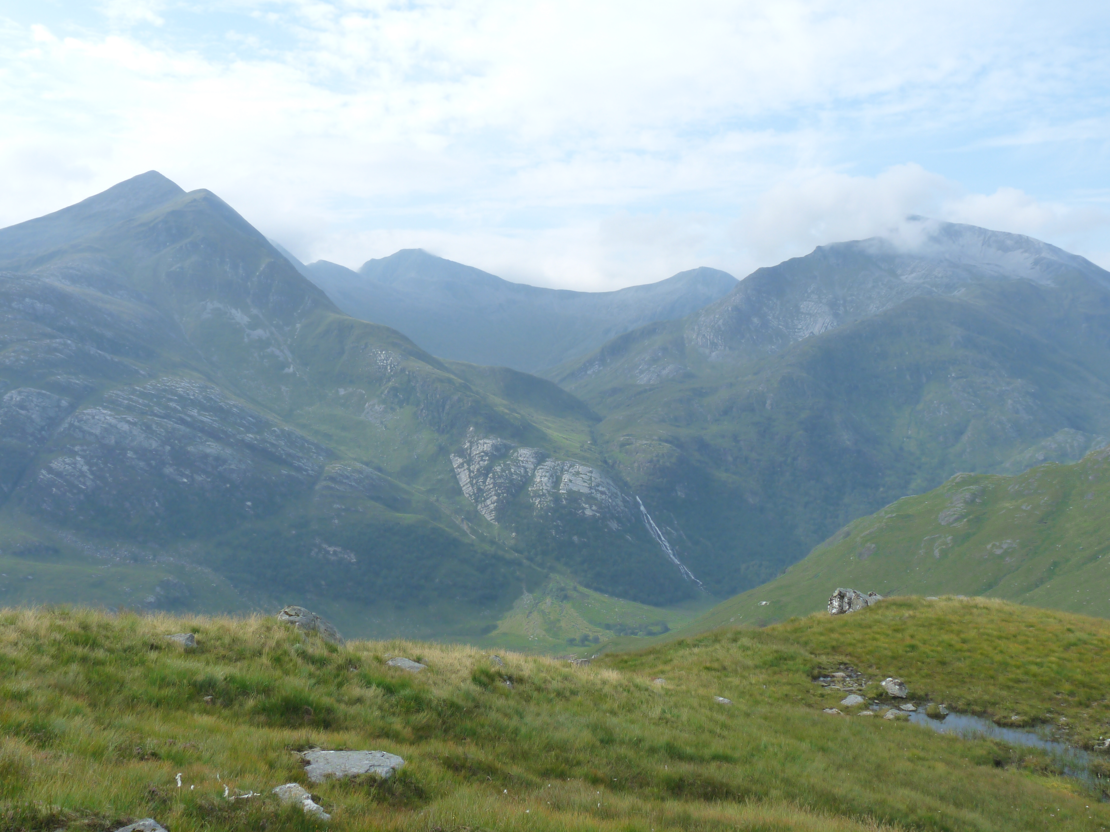 So it was a mid-day start from a basking, bustling Waterfall Carpark. Two minutes straight up the hillside, though, and we were on our own. The first target was the Bealach Cumhann. Hot work through tall grass, with only occasional hints of a track…
