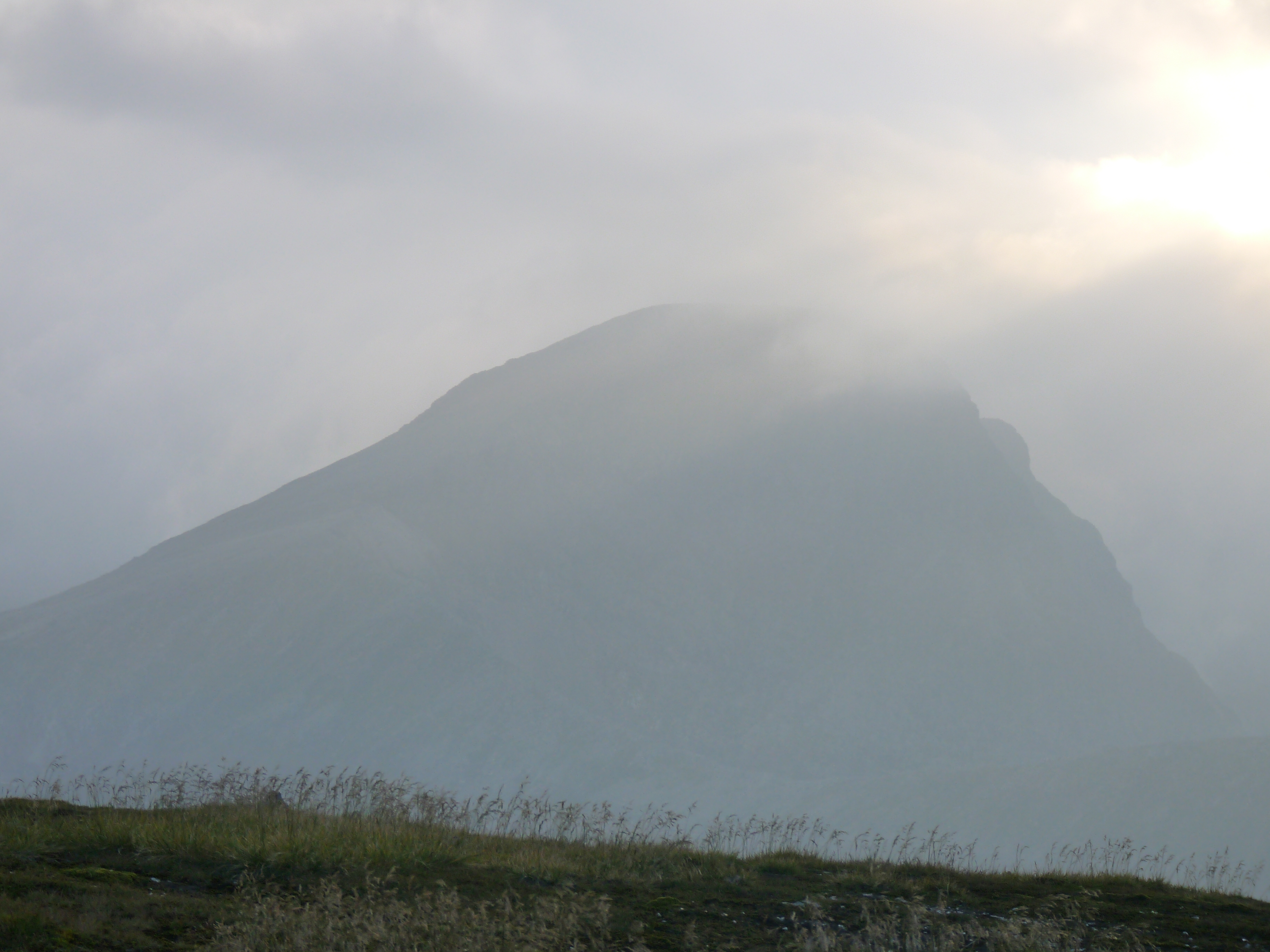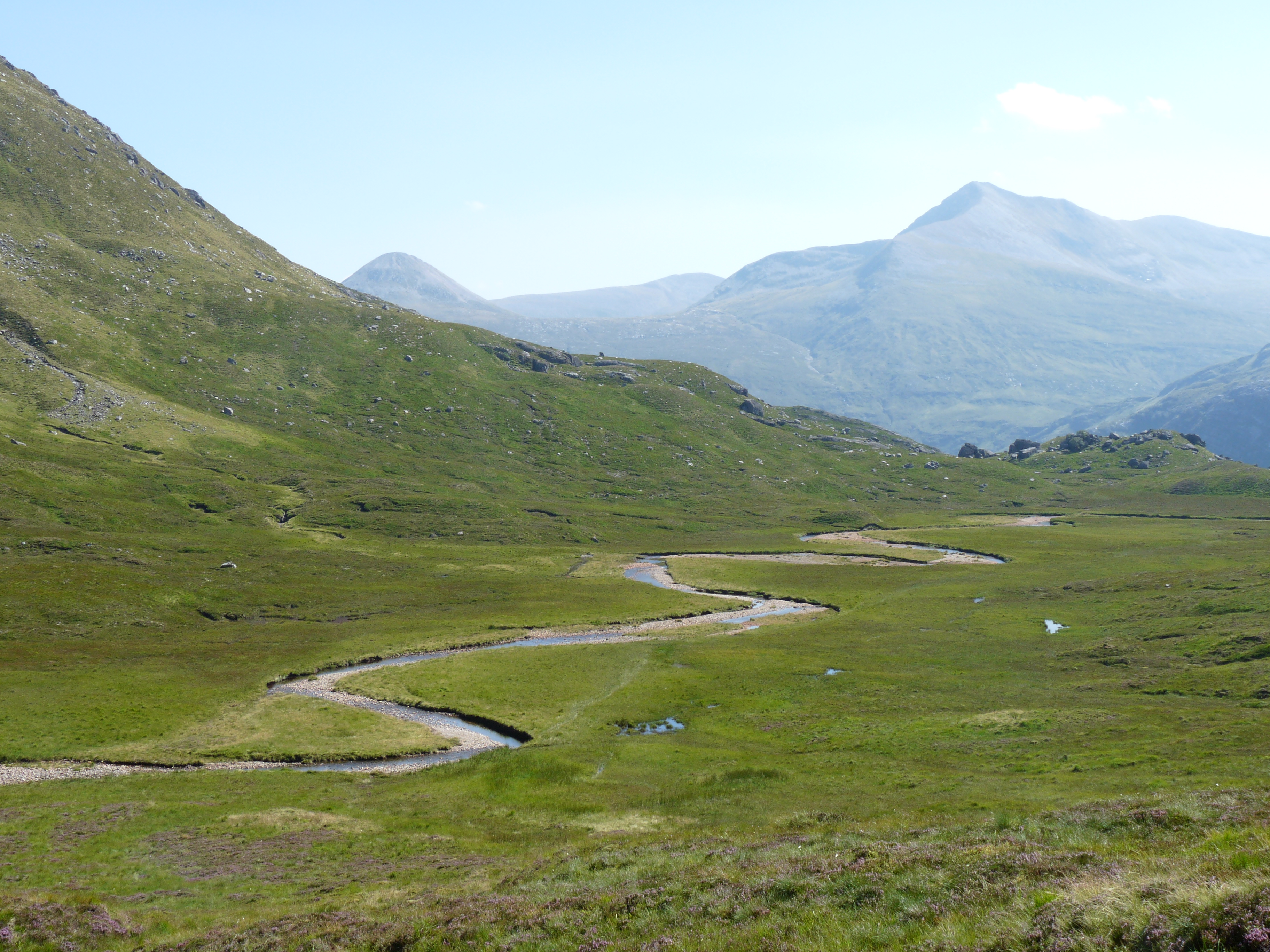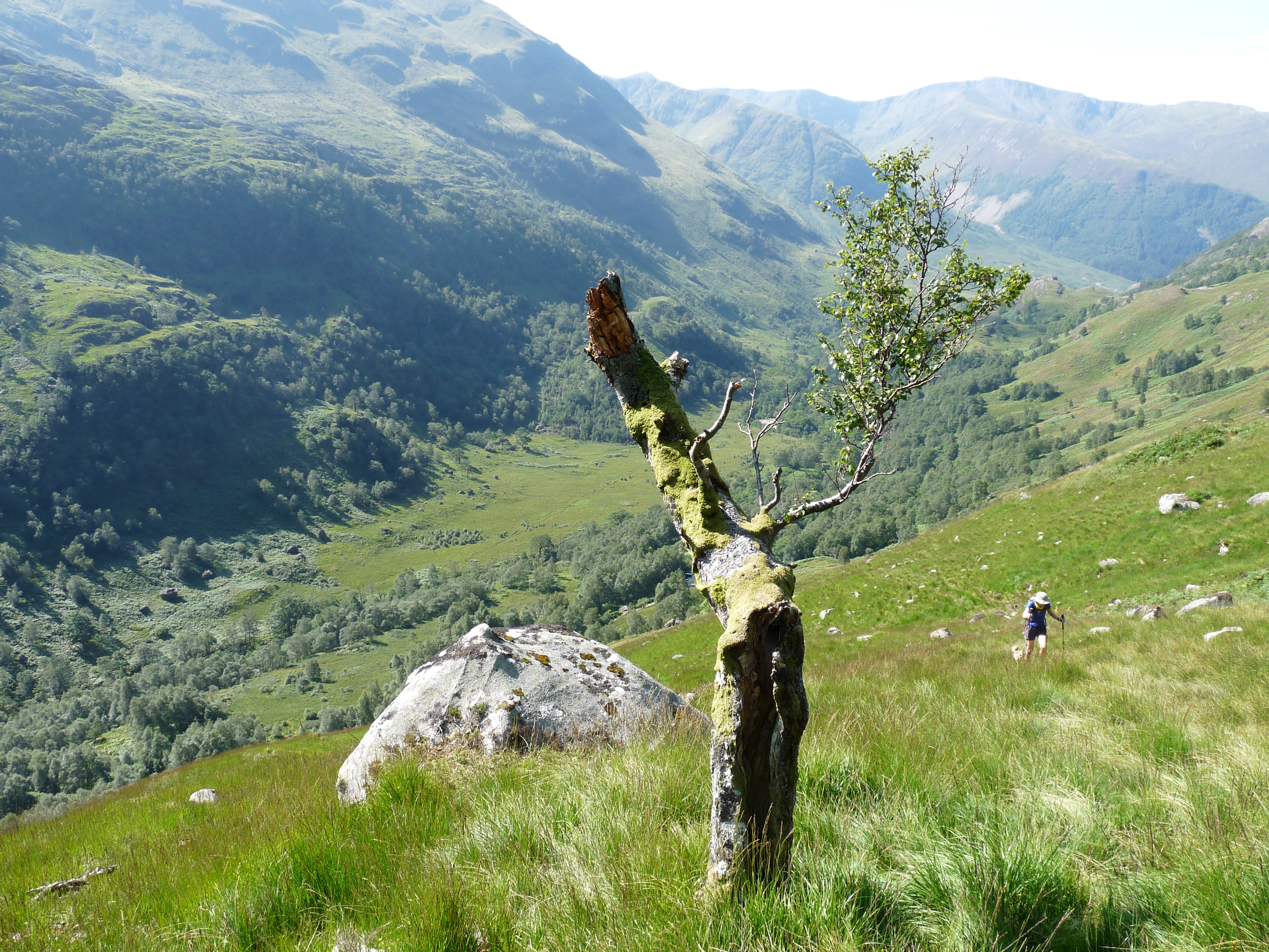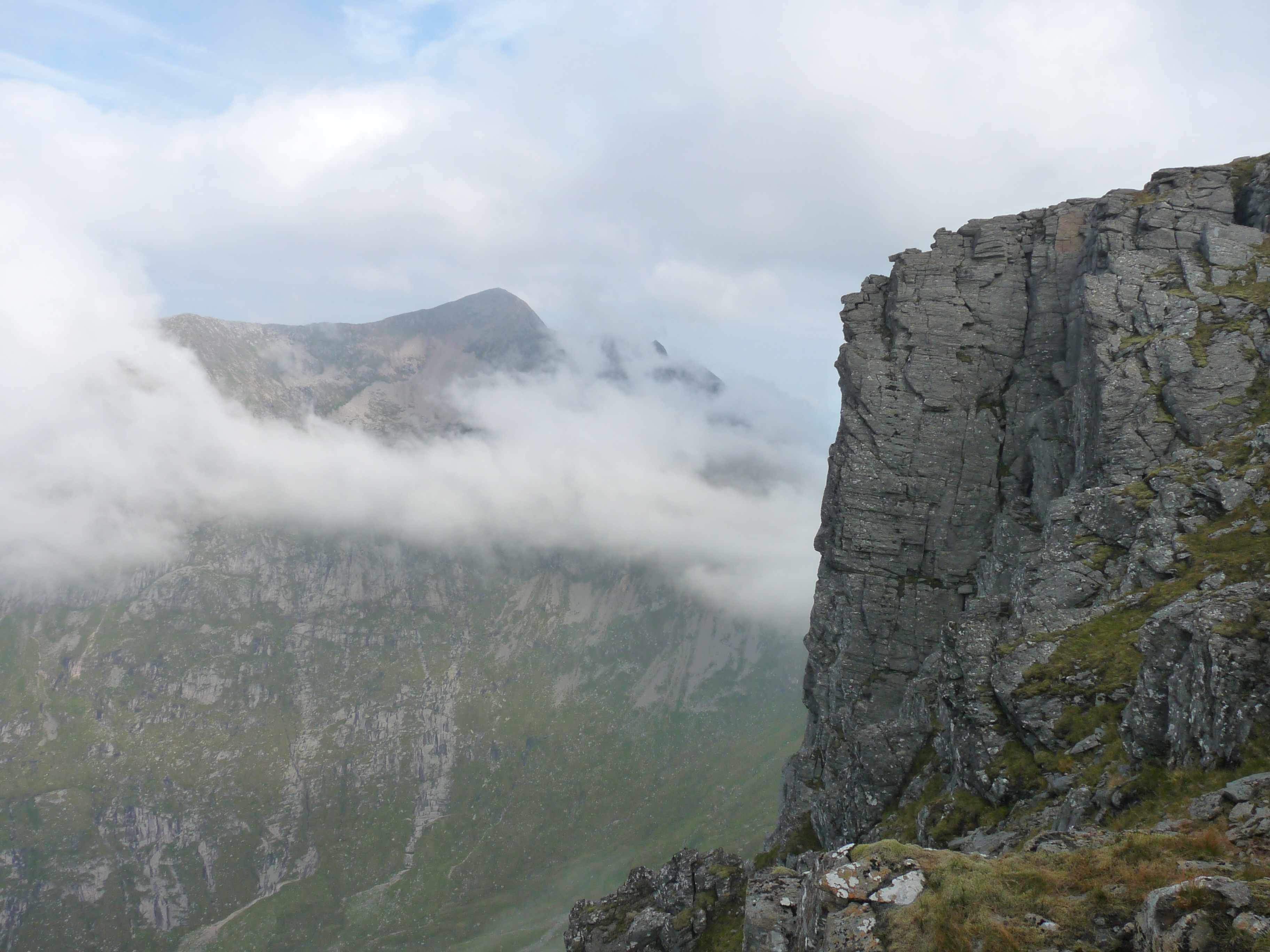 So it was a mid-day start from a basking, bustling Waterfall Carpark. Two minutes straight up the hillside, though, and we were on our own. The first target was the Bealach Cumhann. Hot work through tall grass, with only occasional hints of a track…