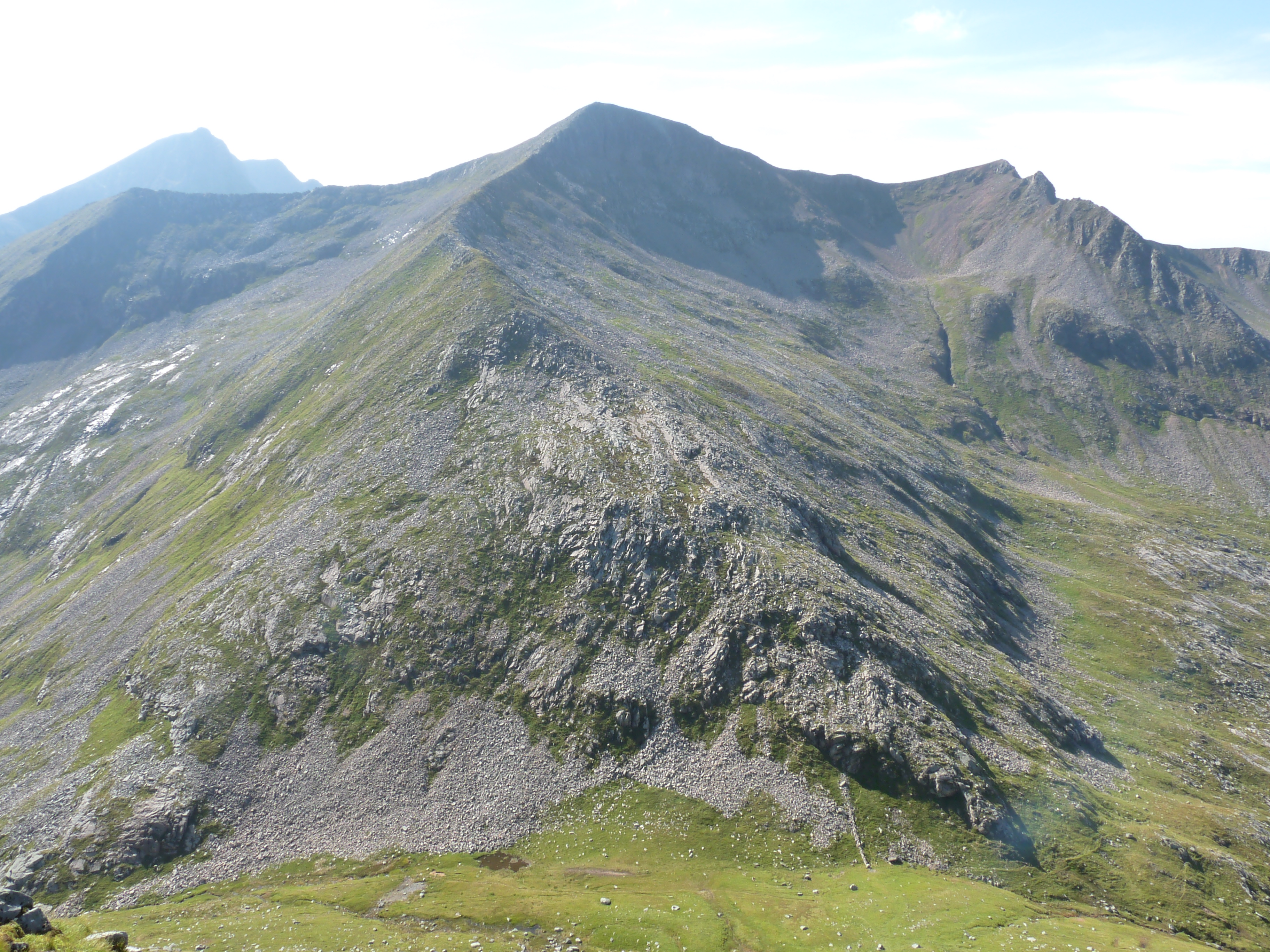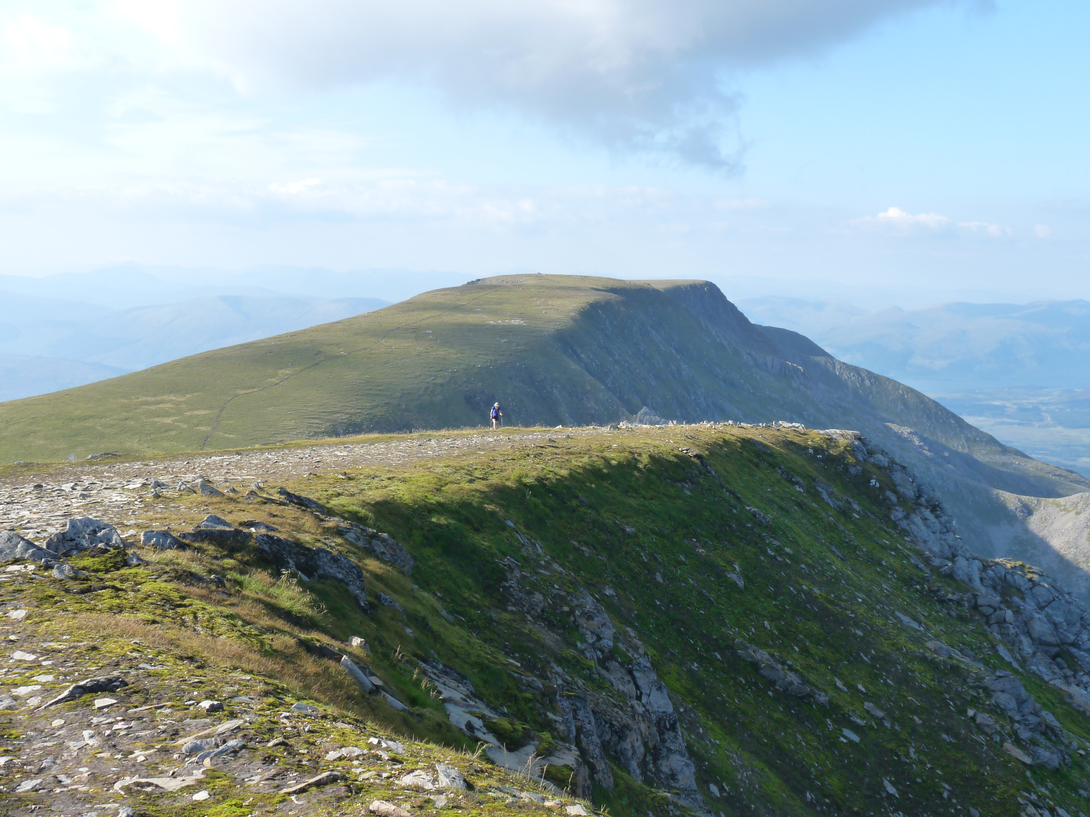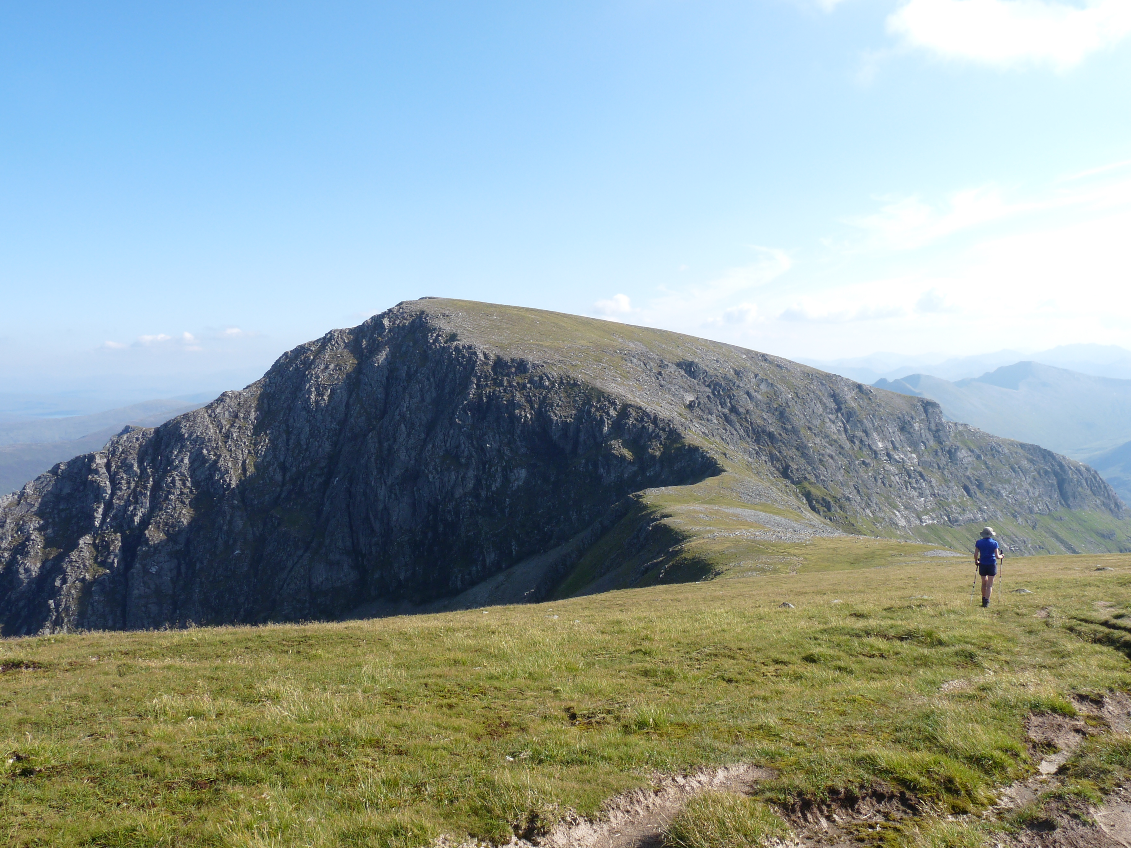 From there we retracked our way down the whaleback ridge, with its distinctive narrow neck of a bealach…