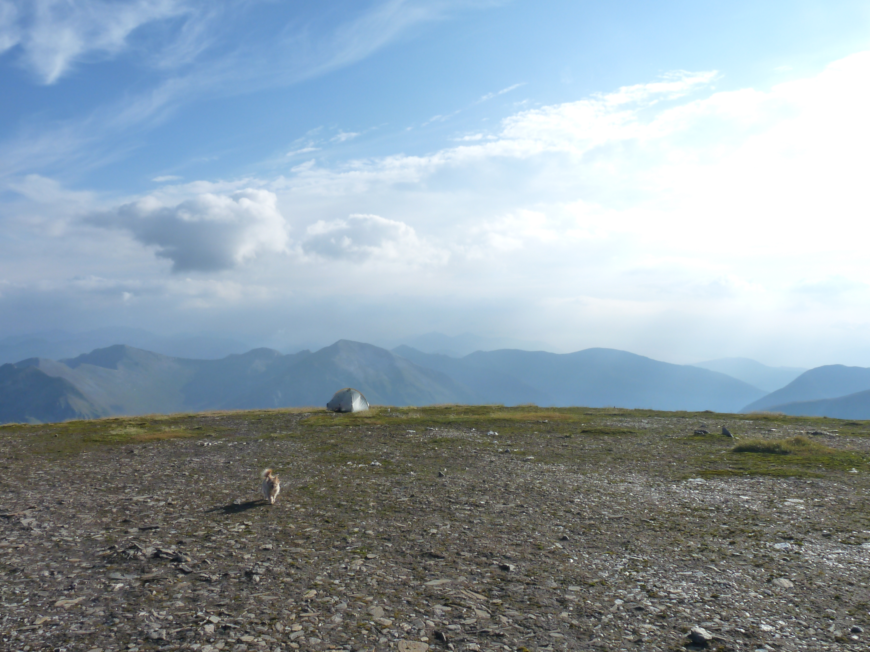 We set up camp a few yards down from the summit, and went back up to the cairn to cook. The dog was pooped with the heat, but being a pack animal at heart, decided she was better off with us…