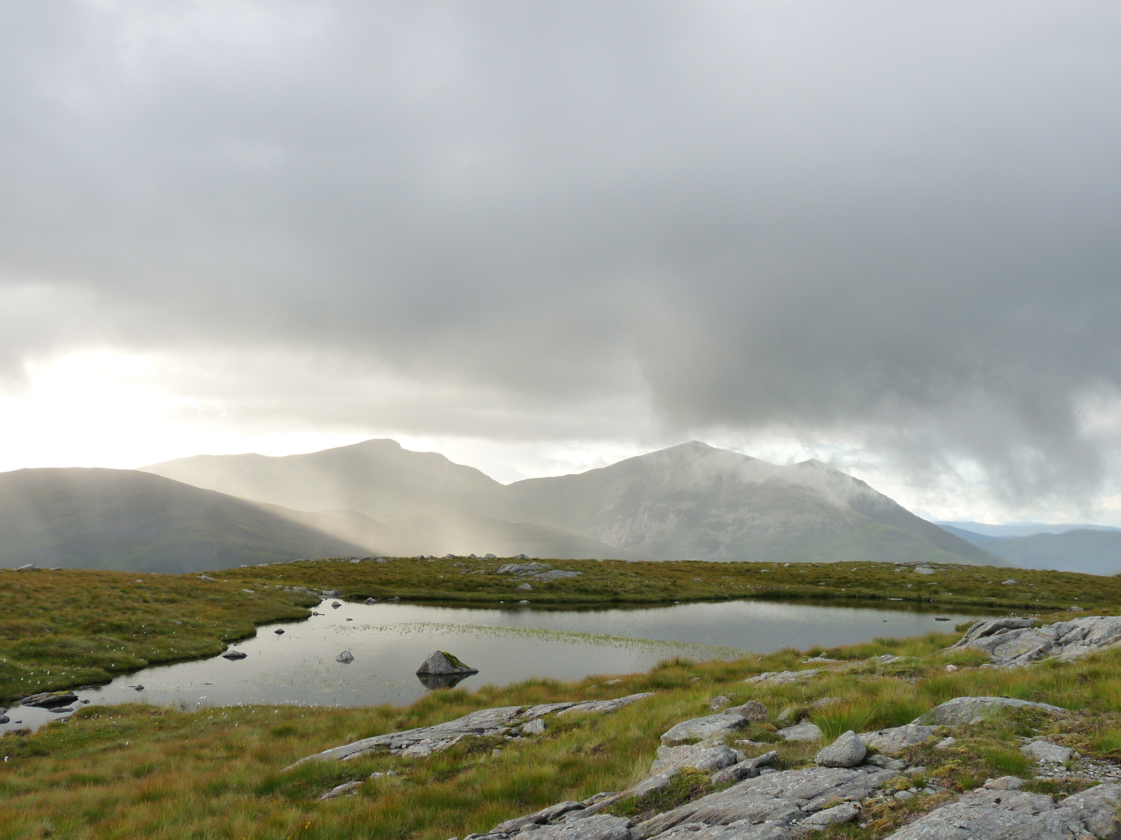 …until we arrived at a likely campsite, near Lochan Cairn Dearg. There's a rush to get the tent up as a shower comes over the Ballachulish Horseshoe, heading in our direction.