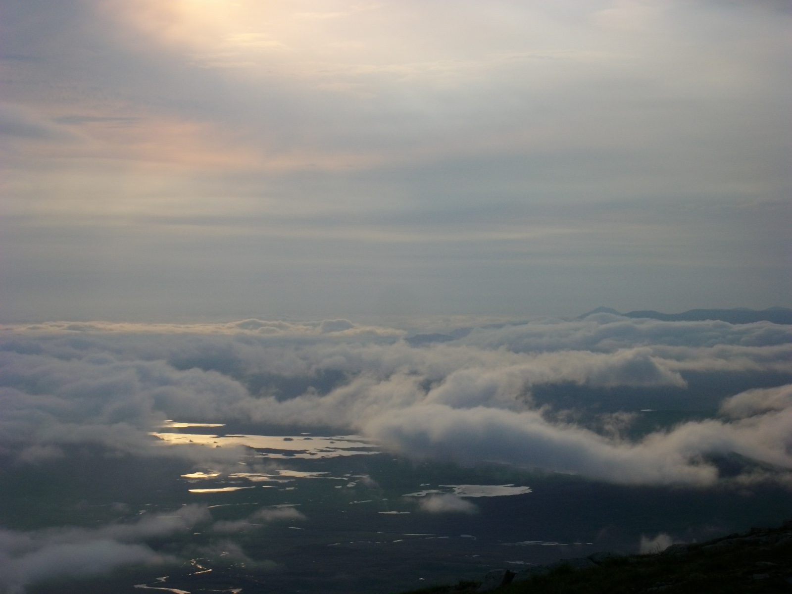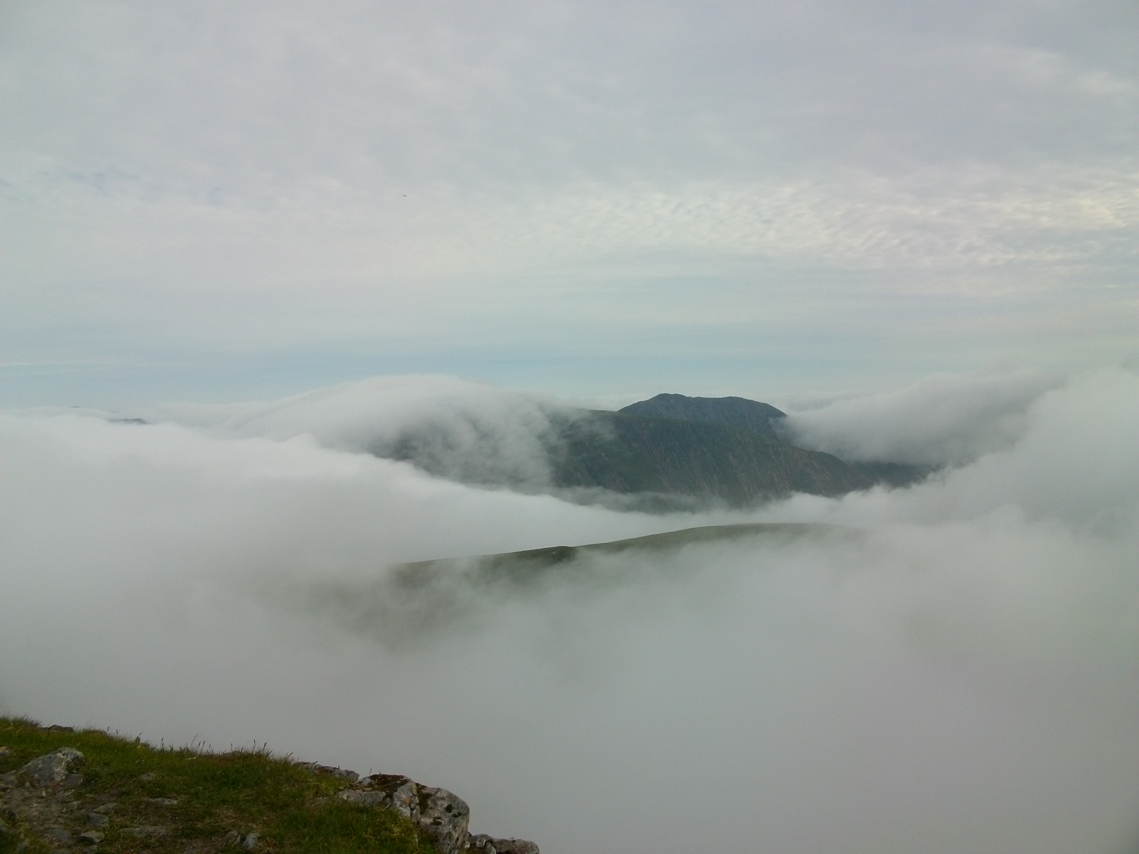 OK, I'll gloss over the next twelve hours back in the tent with one word: ugly. Thankfully, when I poked my head out at about 6 the following morning we were in thick clag. The weather certainly wasn't dragging us out of the tent, and we didn't take much persuading to sleep on. Eventually, after about 15 hours of pretty nauseous sleep, we woke up to glorious conditions. Clouds burning off! I felt better, and Caroline said she was feeling better. So off we went again, retracing yesterday evening's route along Aonach Mor which, in this next image, looks curiously off-colour. So, I soon realised, was C.