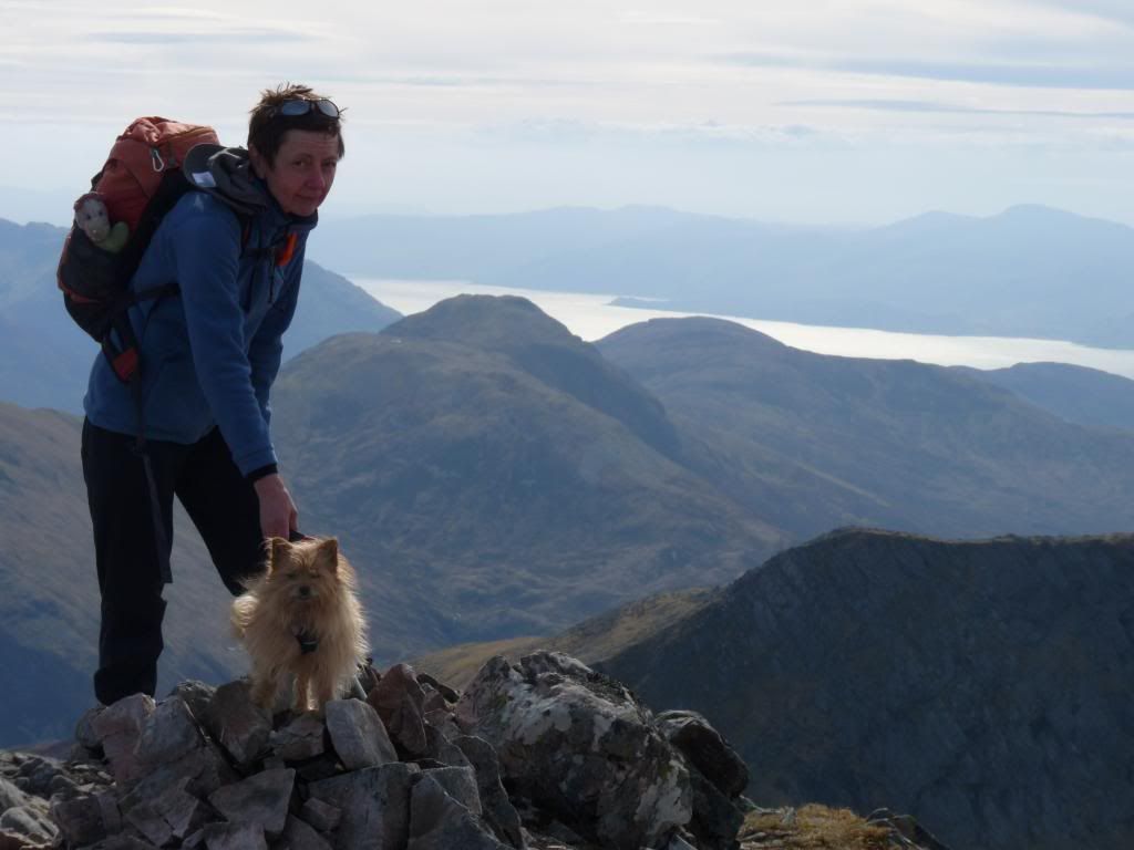Up Sgurr Elide Beag. Notice that whilst C is casting a lingering look back towards the camp site, Sadie has no nostalgic glint in her eye: lunch, she knows, lies ahead.